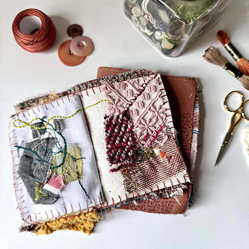 Let your creativity flow as you slow stitch a fabric journal composed of your favorite embroidery stitches, embellishments, and fabric scraps. Build a repertoire of embroidery stitches combined with other textile-based elements to produce a finished, bound fabric book with a personalized cover by the end of the class.