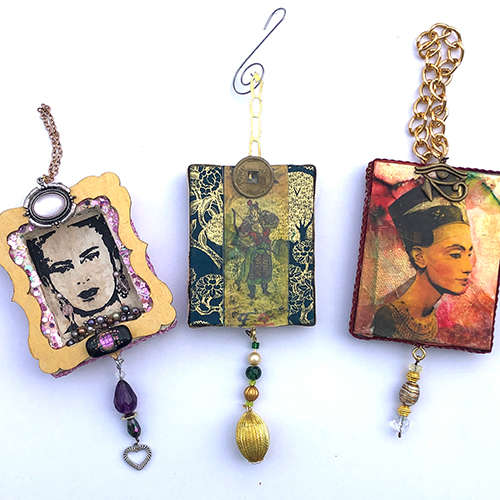 This workshop is an opportunity to create small hanging artworks that can be individualized in many ways to fit any gift-giving occasion. The ornaments are made using miniature canvases as the base and decorated with papers, paint, ribbon, cord, found objects, beads, and other materials. It is an opportunity to incorporate photos and other types of personal mementos, giving them new life in an alternate form.