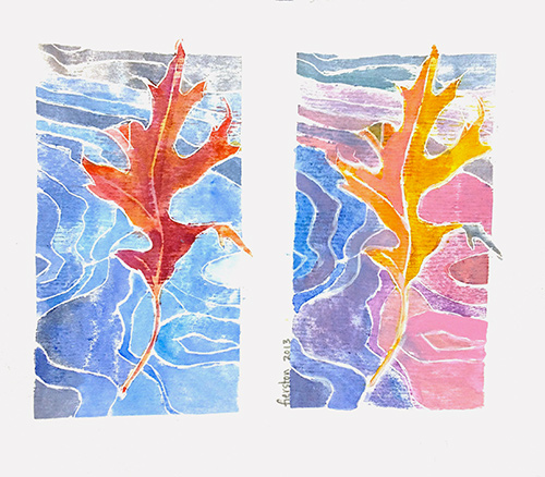 White-line woodcuts are multicolor images printed from a single block of wood. Also called Provincetown prints, they are a hybrid of monoprints and Japanese-style multi-block woodcuts. Learn to create your own by cutting a nature print or simple line drawing into a wood block with a knife or gouge, creating the “white lines” when printed. Color each area between the lines with watercolor or gouache and rub your paper with a wooden spoon to print the color, one section at a time. As in traditional woodblock printmaking, you can use your block over and over, creating original monoprints each time.