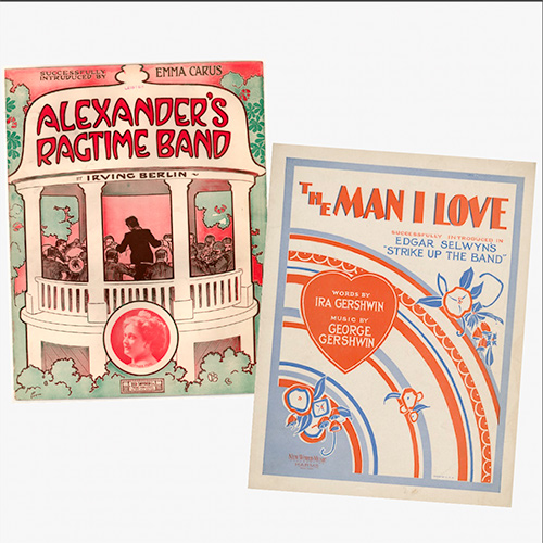 Sheet music covers for “Alexander's Ragtime Band," 1911 and “The Man I Love," 1924