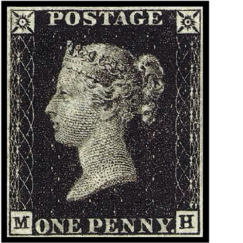 Penny Black, the first postage stamp in the world, issued by Great Britain in 1841